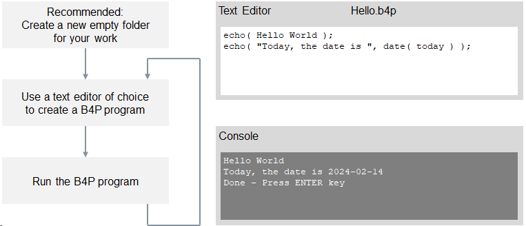 B4P can either be started directly where, by default, interactive mode is activated, or alternatively programs written in B4P (with the file ending .b4p) can be executed directly. Windows, LINUX and MacOS provide easy means to start B4P, either by