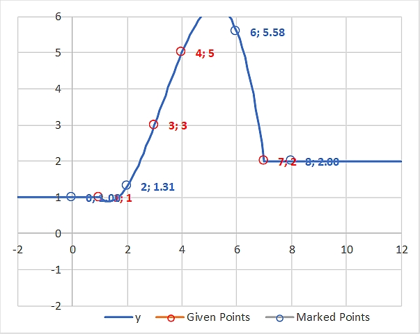 Example 1: linear interpolation ( x[ ], { 1, 3, 4, 7 }, { 1, 3, 5, 2 }, 0.1 ); // Using slope = 0.1